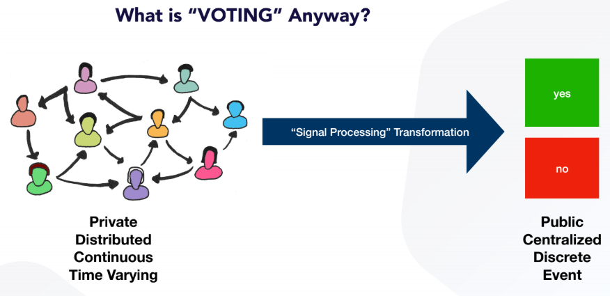 Legacy voting systems face several difficulties in transforming private, distributed, continuous and time varying individual signals into public, centralized, discrete and event-based outcomes. Conviction Voting is a real-time governance tool designed to aggregate collective preferences, expressed continuously.